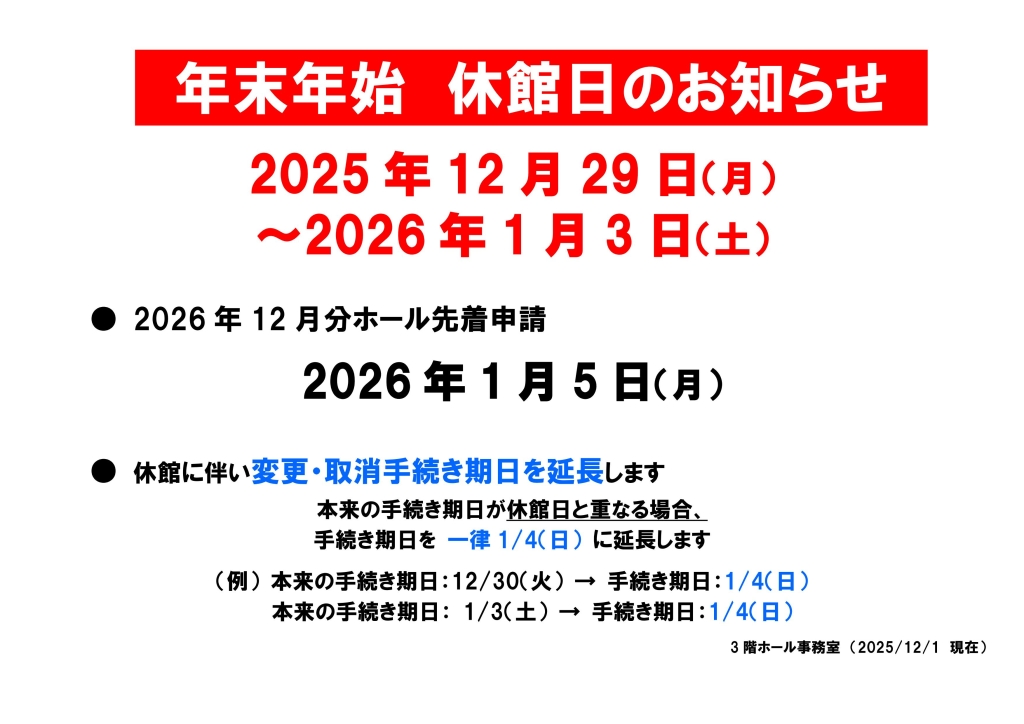 いつも当館をご利用いただきありがとうございます。 年末年始の休館に伴い、以下期日が変更いたします。